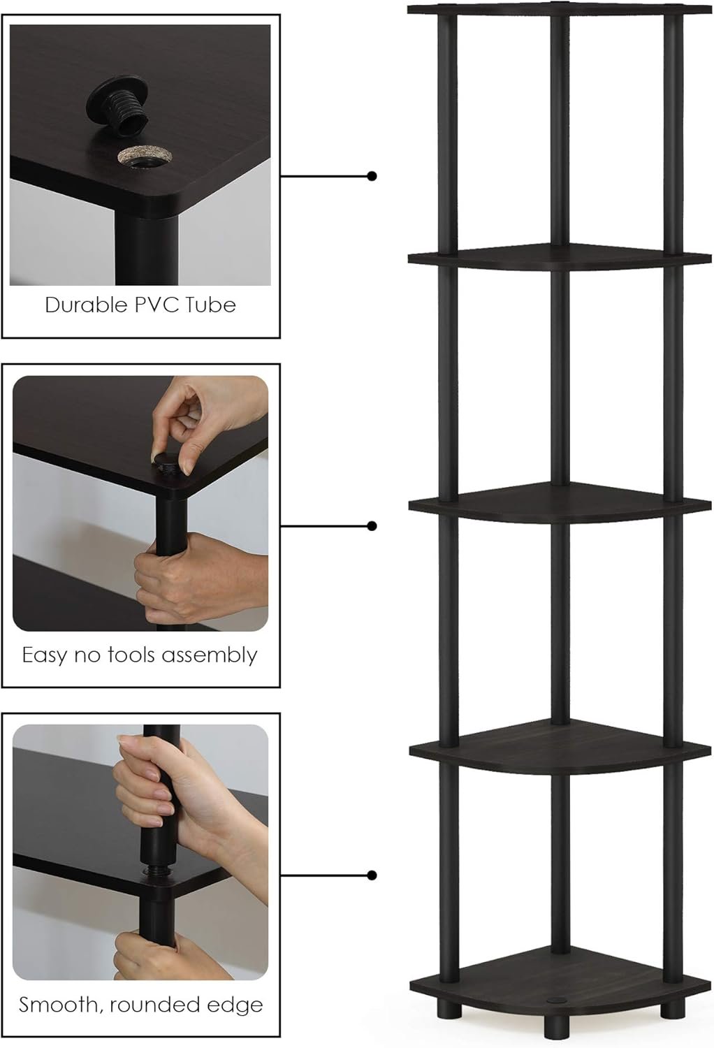 One of the biggest advantages of this corner shelf unit is its tool-free assembly. Thanks to Furinno’s Turn-N-Tube technology, you can put it together in minutes without screws or heavy equipment. Simply twist, turn, and tighten the poles to connect each tier.